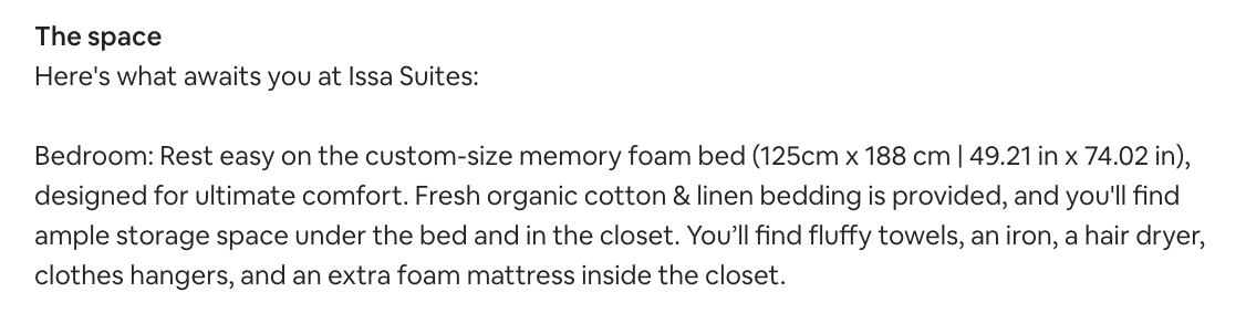 "Hi (Guest's Name)! We're thrilled you're coming to Issa Suites! Just wanted to confirm the bed size for your stay—it's a comfortable 125 cm x 188cm. If you'd prefer a slightly larger sleeping arrangement, we'd be happy to set up two single floor mattresses for you."