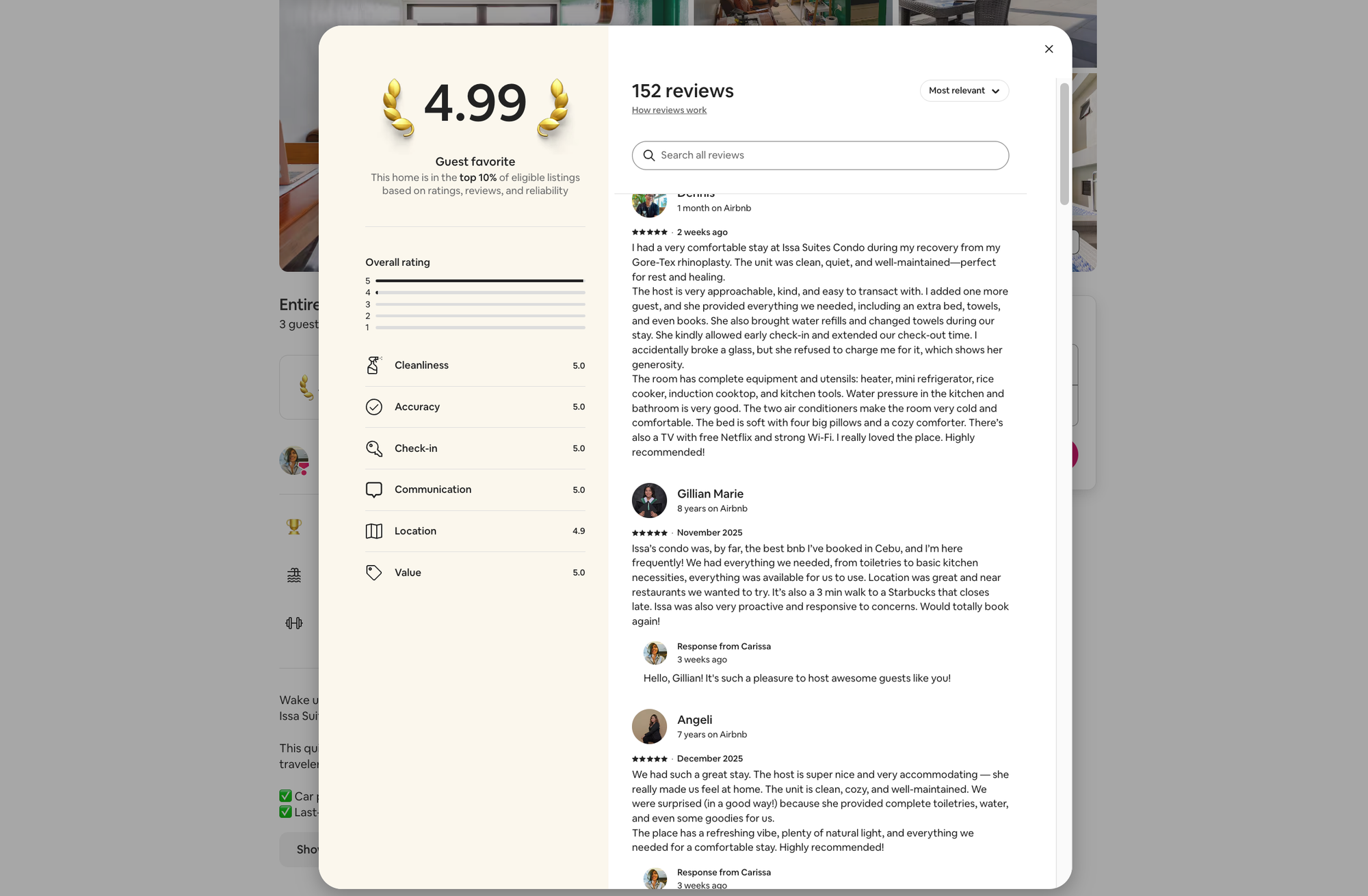Now, after 152 guest reviews (151 five-stars⭐⭐⭐⭐⭐), ₱1.1M+ in revenue, and three years of hands-on hosting, I help hosts go from invisible to fully booked with 5-star stays. I specialize in the Cebu market, navigating the specific expectations of both local staycationers and international digital nomads.