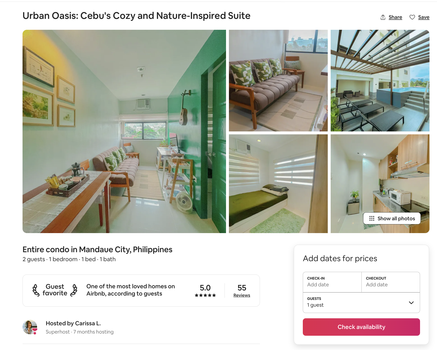 After living in the space for over three years, we anticipated wear and tear. Every aspect, from floors to the kitchen counter, bathroom, and AC units, underwent thorough checks. Everything had to be in excellent working condition before we even started thinking of furniture or wall painting. - Curate your space and listing to attract your ideal guests. Forget trying to please everyone; instead, focus on crafting a haven that resonates with your ideal guest. We were aiming for a serene escape, so our design choices are all focused on communicating this clearly. A calming green accent wall, an award-winning nature photo by Celine Murillo, Cebu-made ukulele, plants, and nature-inspired colors at Issa Suites are deliberately picked to achieve this.